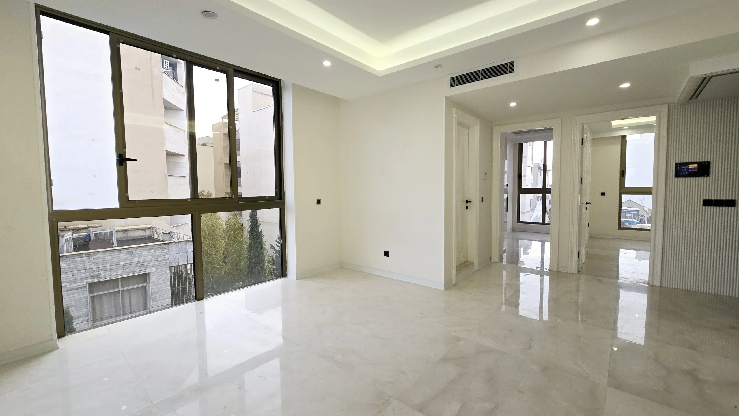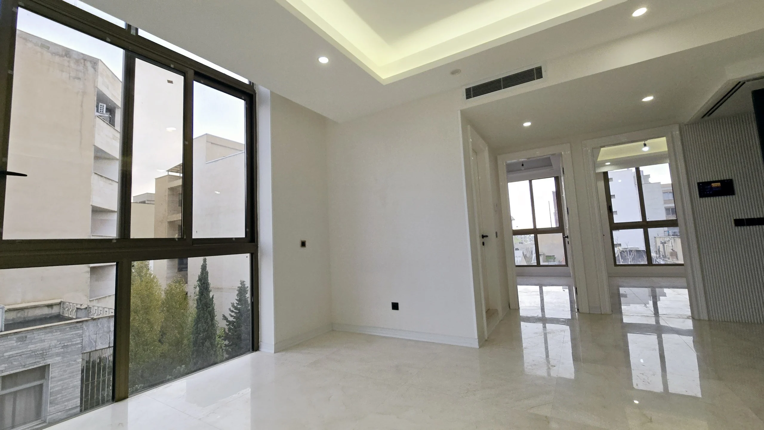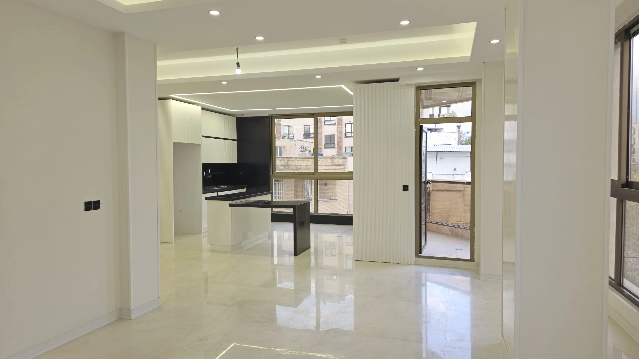- سالن پذیرایی بزرگ و قابل چیدمان با پنجرههای قدی بزرگ و نورگیر