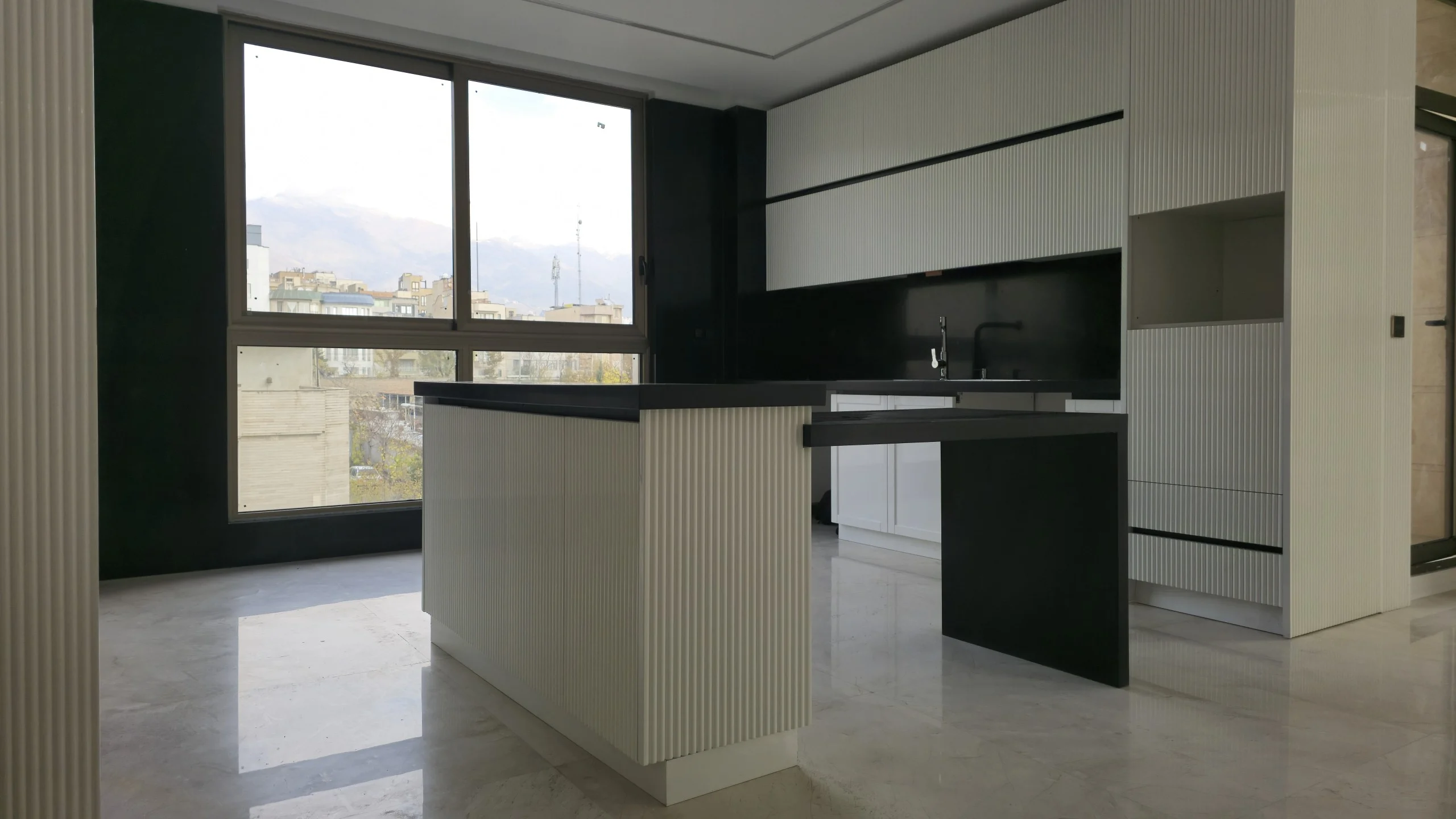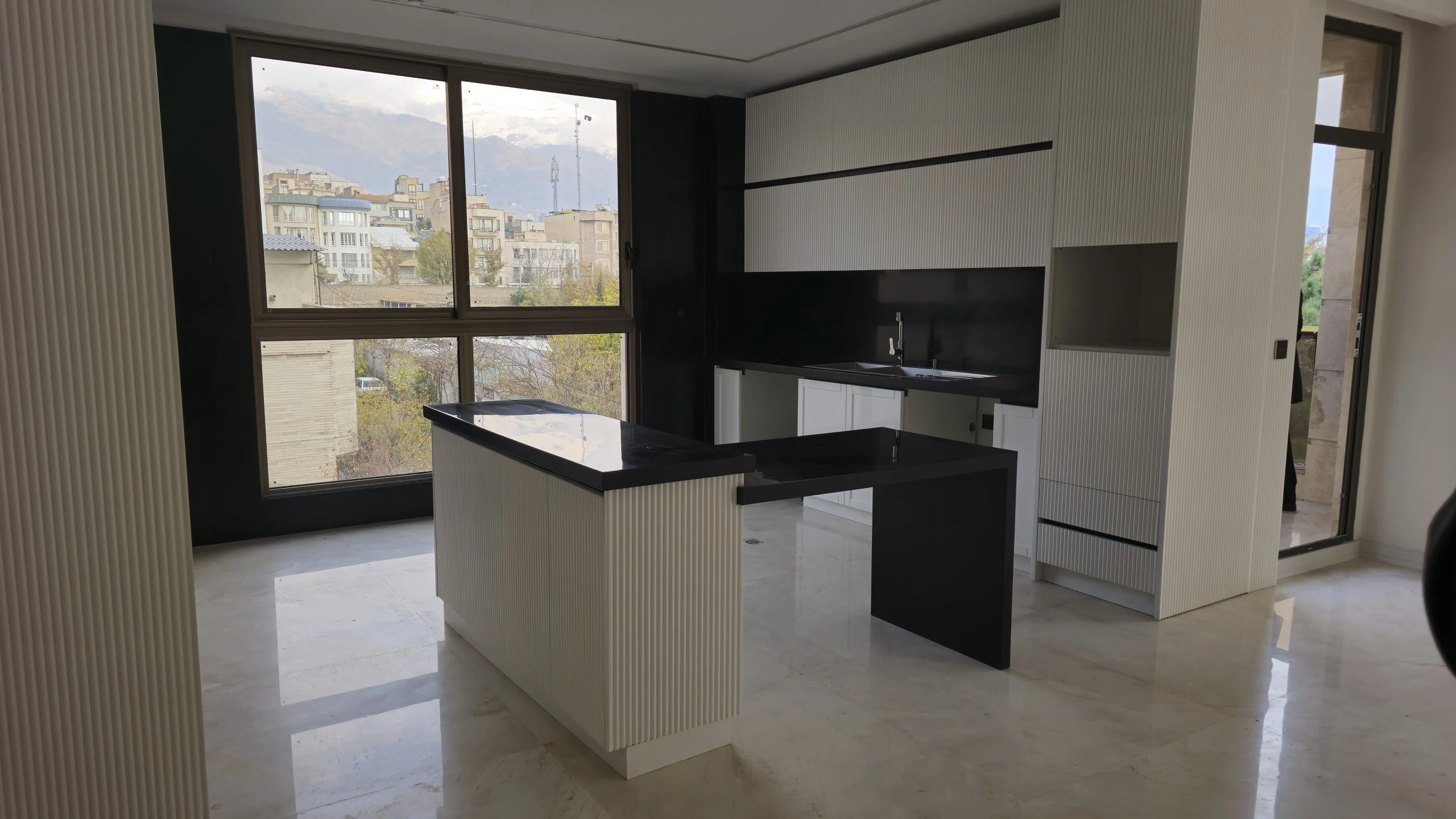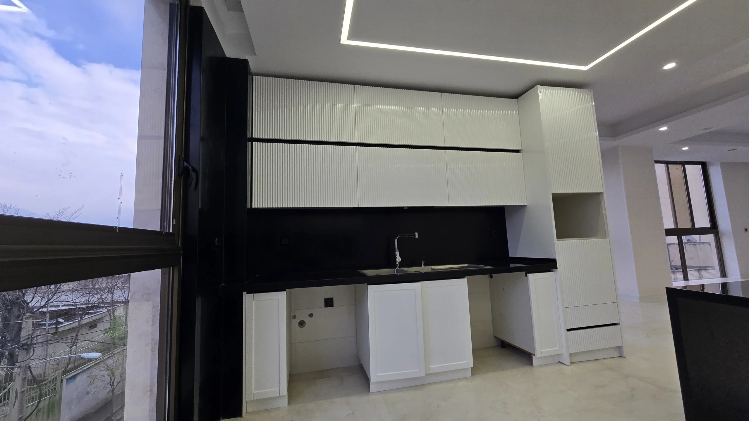 - سالن پذیرایی بزرگ و قابل چیدمان با پنجرههای قدی بزرگ و نورگیر
